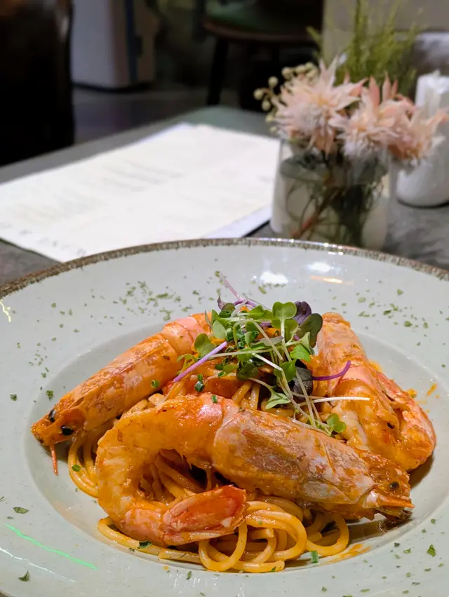 海蝦搭淡茄汁醬底,酸冧中帶鮮香,海鮮味強烈,意粉醬汁掛得均勻,大蝦彈牙爽口。