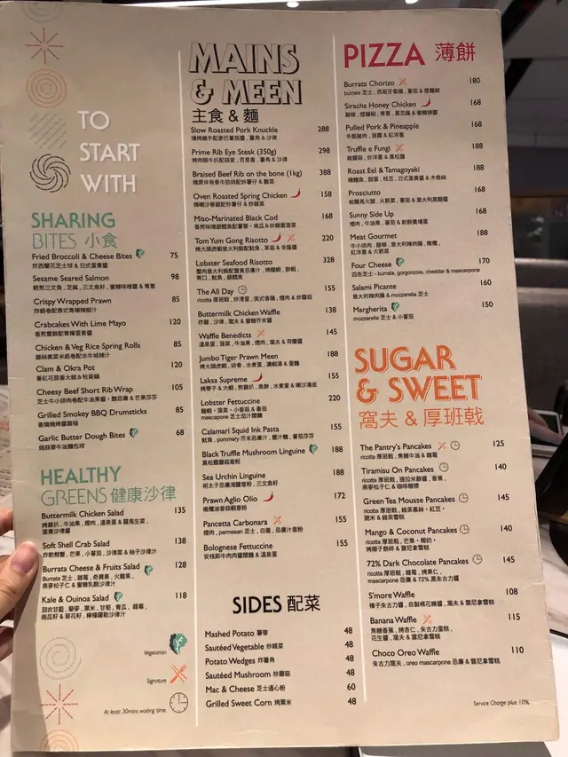 Menu顯示了多款食物,除了最出名的甜品,還有小食,意粉、意大利飯及pizza