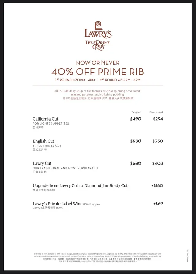 After a friend sent me the Lawry’s 40% off promotion, I immediately asked my friends if they were interested and within minutes we booked a table for the weekend. I have heard of Lawry’s this was my first time visiting. The entrance is where you check in and behind is a glass elevator and a stair case, when you get up the stairs you enter a grand dining room with high dome, the decor is traditional and seating is spacious. Shortly after being seated we were given the prime rib promotion menu and offered water. I ordered the English Cut which is three slices, the California cut is one slice but thicker. The prime ribs are carved in front of you from the iconic silver carts. The meat is served with mash, Yorkshire pudding and gravy, and you offered spinach and or sweetcorn, note that theses two options will incur a cost. The starters is either a soup or the famous spinning salad. I choose soup of the day which was crab meat soup, this was warming creamy and tasty with actual crab meat. My friend choose the salad, not pictured here but it was also very good. Next came the mains and the moment I had been waiting for all week, the English cut prime rib with mash, Yorkshire pudding, spinach and gravy. The prime rib by default is served rare which is my preference. I sample a piece of the prime rib before mixing with the side dishes and there was instant satisfaction, the meat is tender, moist and flavoursome. I then go on to try the Yorkshire pudding, this was made well, crunchy on the outside and soft on the in. The creamed spinach was flavoursome and went well with the smooth mash potato. Next was to combine all the food items on one fork with some horse radish, be careful as it’s extremely hot. That bite with all the food items was extremely satisfying. I should have come here sooner! Highly recommended even if there isn’t a discount.