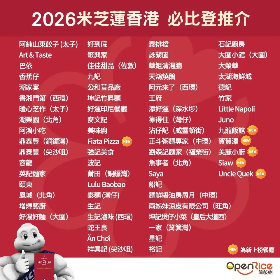 《香港澳門米芝蓮指南2026》必比登推介出爐了!今年合共83間餐廳上榜,香港佔70間,澳門就有13間,當中有8間餐廳為新上榜餐廳(香港6間,澳門2間),包括薄餅、粵菜、潮州菜、泰國菜等等。各位美食達人立即更新Bucket List吧!