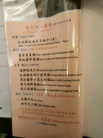 澳門本地人推介,所以專程到訪試一試。發現真係有驚喜,標榜是前澳督府廚師主理, 所有食物質素都很不錯,而且用料新鮮。聽說這家餐廳曾經是有錢人才可幫襯,之後搬到來這裏價錢才變得親民。 八百幾蚊四人餐,的確不貴,而且食物質素及選擇 都好啱我哋口味,頭盤的扒大蝦確實很好味,非常大隻,而牛肉亦煮得好冧,容易入口。四人餐還包括木糠布甸作甜品,所以基本上不用再花費就可享用所有葡國美食,的確抵食。餐廳環境闊落,可以慢慢坐,服務亦非常周到,附近又多商店,所以食完飯行下街都唔錯。另外好近大三巴。 不過泊車就要泊去附近的停車場啦。銀座泊車$12一小時。…查看更多