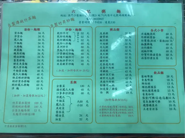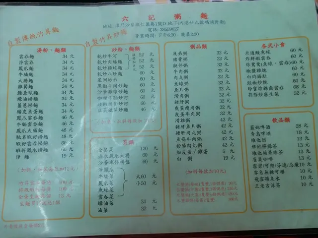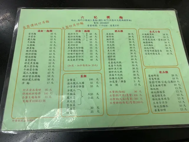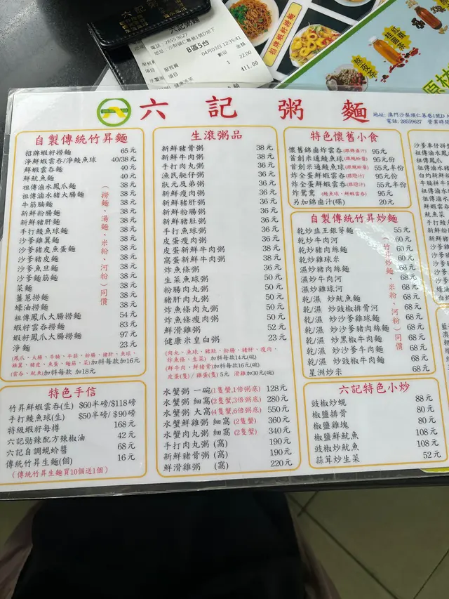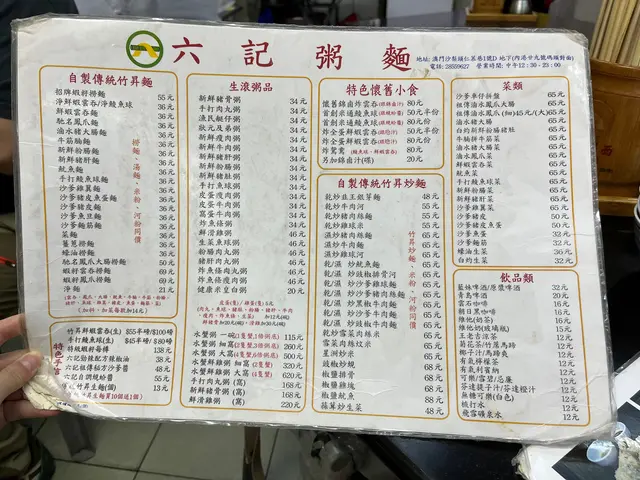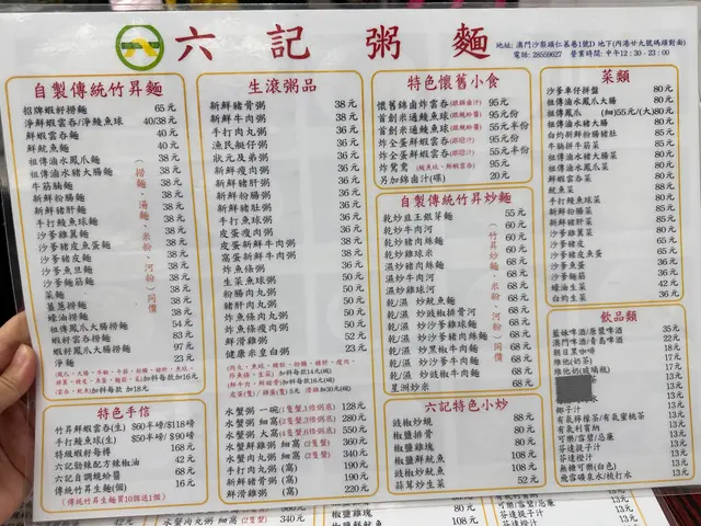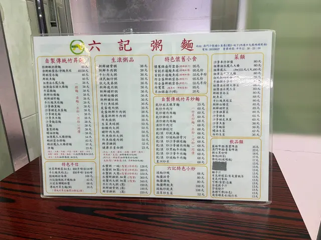 六記粥麵 (沙梨頭) 網址: https://s.openrice.com/QrbS1Mru000 地址: 澳門沙梨頭沙梨頭仁慕巷1號D地舖 電話: +853 28559627