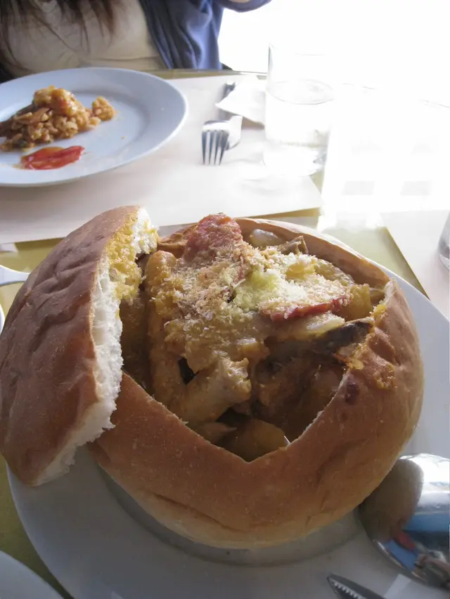 去澳門, 很多時候都會選擇到自助山, 因為款式多, 味道不錯, 又比香港的自助餐划算不過人大了, 胃口不及當年, 亦討厭爭食的感覺, 同時, 想多試新事物所以今次起行之前, 在OR找了好幾家未食過的來試一試星期六澳門人流如鰂, 怕full house, 特別在這炎夏, 若要我在戶外等位, 我寧可捱餓, 故我預先訂檯, 亦預留了一份必試主菜 - 原隻燒雞雜菌焗飯8點準時到, 樓下一個食客都沒有, 原來樓上已坐了一大班人地下店面較細, 大部分空間撥作廚房之用, 裝修顯得陳舊, 牆身油漆剝落, 幸好我不是「食裝修」的人一坐下, 侍應即遞上一大支冰凍礦泉水, 讓我可以即時解渴降溫 (另一檯一家五口的客人, 侍應端上的是未經雪藏的礦泉水, 應該是怕老人家及小朋友喝不慣, 可見其細心) 還未點菜, house bread 已準備好, 麵包熱得燙手, 是一個好開始 (8/10)除燒雞焗飯之外, 我們點了兩款招牌菜 - 白酒煮蜆 及 黑椒燒羊脾, 另外再加一個凱撒沙律先來第一道白酒煮蜆, 滾熱辣的瓦煲裡面裝滿帶黑邊的蜆, 還有少許青椒作點綴, 感覺有點中式。蜆像蠔仔般小, 甜味不是很豐富, 但總算新鮮。這道菜的精髓在於白酒汁, 像忌廉湯一樣香濃, 我好不客氣的叫侍應拿個湯碗給我, 把這「湯」喝完。若然蜆大隻一點, 我會給個滿分。 (8/10)緊接的是主角 - 原隻燒雞雜菌焗飯, 看來不是很大, 比春雞稍為大一些。雞皮燒至金黃色, 很吸引。刀子壓下皮層已聽到咔吒的清脆聲音, 熱氣隨即從刀縫湧出來, 香氣撲鼻。把燒雞分半打開, 原來皮層已沒有脂肪, 我的戒備心而大大降低, 準備大開吃戒。雞肉炒飯將整隻雞塞得滿滿, 應該夠5人享用。香脆雞皮與炒飯同吃, 真的非常美味。美中不足的應該是雜菌不夠多, 多放一些可增加爽口感。最後我們三人都不能將其解決, 唯有帶走。(9/10)有薯條伴碟的黑椒燒羊脾應該沒有用黑椒做醃料, 黑椒應該是指分開上的黑椒汁。五成熟, 中間肉色還帶少許粉紅。肉質不夠稔, 無羶味亦無羊味, 頗失敗的一道菜。(5.5/10)更失敗的原來還沒到。主菜已上齊, 沙律還沒上。侍應解釋是要烚蛋。首先, 為何凱撒沙律會有蛋? 再講, 烚蛋可以比燒羊脾更花時間? 解釋有點牽強。沙律菜用了普通生菜, 完全沒有爽脆口感, 因為所有菜都被輕微帶酸味的沙律醬"醃稔"。麵包糠沒有被炸過, 應該有焗過, 不過已被濕氣軟化, 還有點韌。更糟的是, 沙律上還放了一些咸度極高的醃沙甸魚, 魚腥味濃烈。這個天氣吃這樣的沙律, 非常不爽, 這是人生中吃過最差的凱撒沙律。話雖如此, 但都不能浪費, 第三世界有很多人仍在饑荒之中。(0/10)來這裡不是為吃羊脾及沙律。一間餐廳的廚師不一定集十八武藝於一身, 未能做到十全十美乃人之常情。要試的招牌菜已滿足到我。這裡的服務不差, 會留意客人的需要。價錢都算實惠, 下次會再來試一下西班牙海鮮焗飯。…查看更多