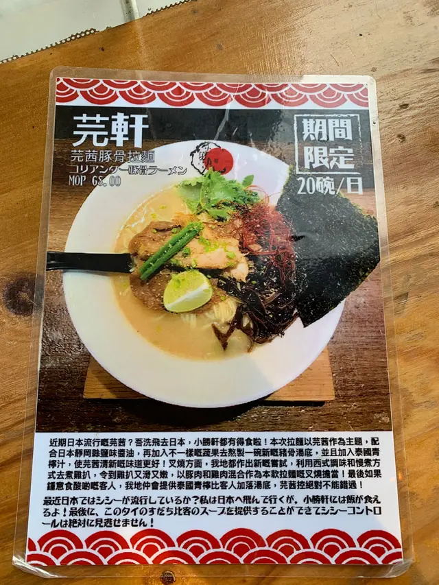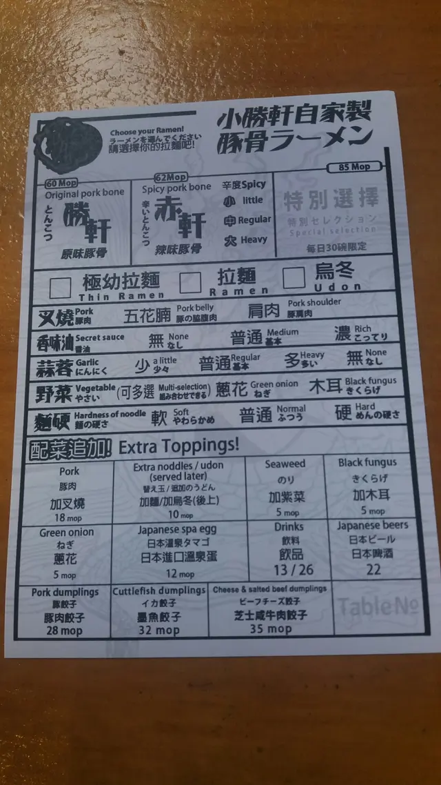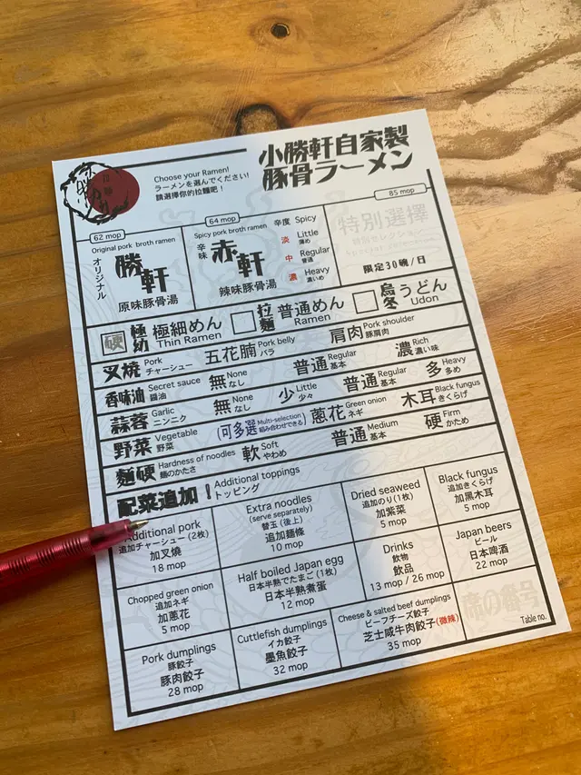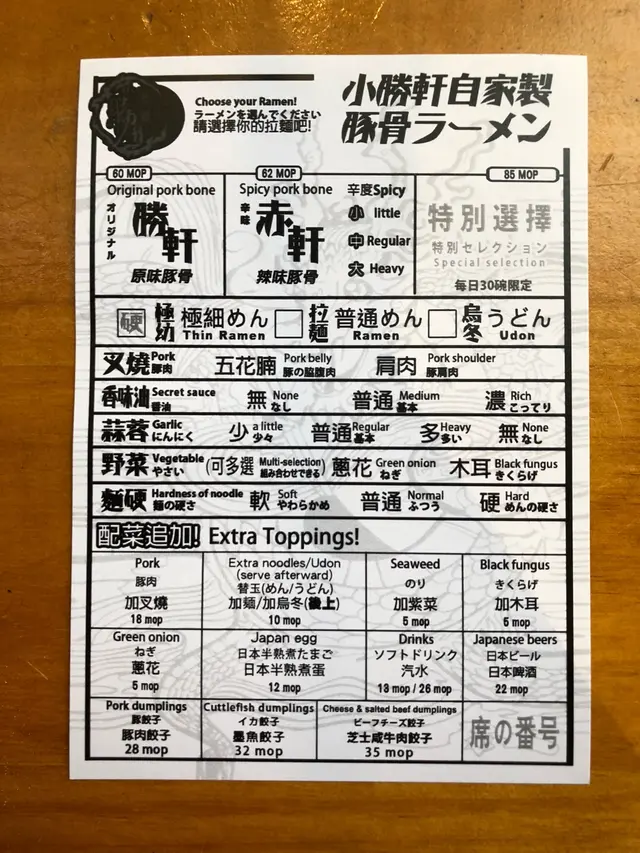小勝軒拉麵 (南灣) 網址: https://s.openrice.com/QrbS1708800 地址: 澳門南灣澳門商業大馬路A11號南灣壹號1樓B號舖 電話: +853 6204 6106