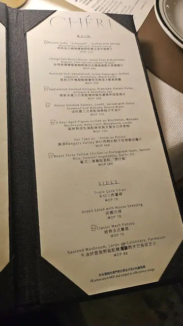 和朋友去澳門一日遊,此前,朋友在社交平台見到Cheri Bistro & Wine有不錯的評價,遂預訂座位在這裡晚餐。店面不大,座位不多,用餐當晚滿座,想要吃晚餐必須預約。雖然餐牌只有兩頁,但選項都足夠。先上麵包,麵包微暖,配的鷹嘴豆泥絕不兒戲,豆泥又滑又香!同行者單是對鷹嘴豆泥已好滿意!但麵包的軟硬度就不是人人可接受,對本人而言是可以的,這也不是我吃過最硬的麵包了。每人限送一份的餐前小食三文魚薄脆迷你撻,一口便可享用。軟滑三文魚蓉配上又薄又脆的撻,大家都讚好味兼不夠喉!馬介休球格利比什醬 (MOP40/件),馬介休球炸得金黃酥脆而不油膩,內裡的魚肉飽滿又絲絲細嫩,蘸醬料來吃就更為滋味。法式鵝肝凍批配巨峰提子伴布里歐修麵包,將鵝肝製成長方形的凍批形狀,鵝肝富香氣,口感軟滑。平時吃煎鵝肝會配酸甜的醬汁或配料,這份鵝肝凍批則配巨峰提子,幸好提子的味道不會過甜,不會遮蓋鵝肝香之餘,亦令味道沒那麼單調。配上外酥內軟的麵包,加添口感層次。牛肉他他配薯餅伴蠔油蛋黃醬 (MOP75/件),是我們有再encore的前菜!牛肉沒有腥羶味,富牛味,又滑溜,醬汁香濃不鹹。平時吃牛肉薯餅,牛肉都是夾在薯餅內的餡料,這道前菜則將牛肉他他置於薯餅上,感覺有趣!蘋果木熏八爪魚配燴甜椒及薯蓉伴迷迭香汁,將八爪魚的觸鬚整齊的堆疊起來,帶點擺盤賣相。八爪魚經過蘋果木熏烤,夠入味,從沒想過八爪魚的觸鬚可這樣柔軟。北海道海膽意大利麵,意粉口感彈牙,海膽鮮甜不腥,只是略嫌整體份量偏少。葡式三黃雞配香料‘煲仔飯‘,燒雞的肉質雖不至於太過粗糙,亦非滑嫩富肉汁的程度。煲仔飯亦不夠香口惹味,這款主食中規中矩。油封煙三文魚配海帶柚子牛油汁,平時吃煙三文魚都是配沙律或是牛角包居多,第一次這樣吃整件的煙三文魚柳,帶淡淡煙燻香,鹹味亦很淡薄。油封煙三文魚不失軟嫩,海帶柚子牛油汁帶點微酸,令人開胃。經典法式薯蓉,薯蓉口感綿密滑溜,惟奶味偏重,不太嚐到薯仔香。這一餐晚飯同時是為朋友慶祝生日,預留了兩件切餅。荔枝海綿蛋糕 (MOP56)及開心果芝士蛋糕 (MOP68),前者帶淡淡荔枝香甜,海綿蛋糕口感濕潤鬆軟。後者的開心果味不算特別香濃,幸芝士蛋糕的味道輕盈不膩,是MOP68的價位偏貴。雖然有些餐點菜式味道一般,但大家對於整體的菜式質素感到滿意。而且人均MOP300左右就試到那麼多款食物,Fine Dine而言都好抵食!…查看更多