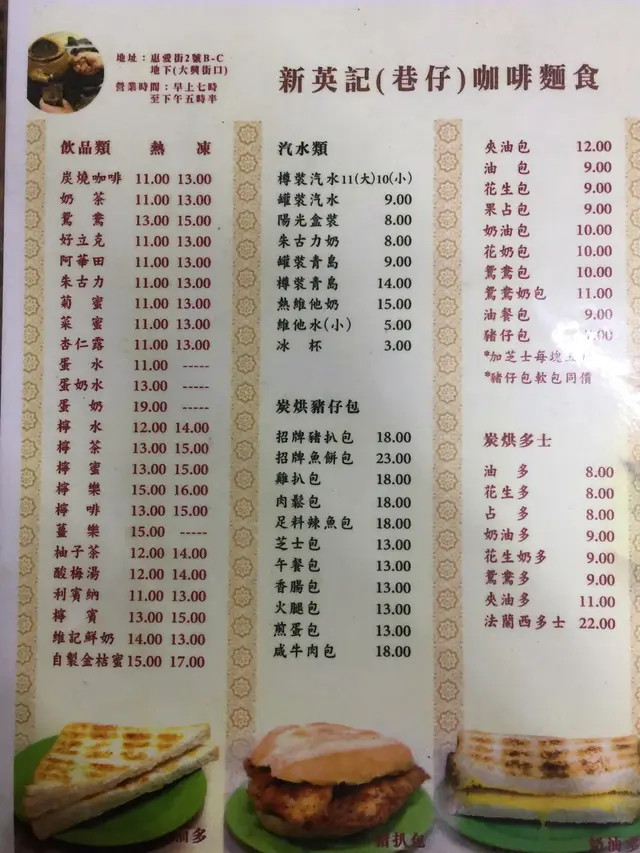 從論壇知道這店有一段的時間,只是因為地點有一些的偏僻所以多次到澳門都未到這店,今次得知這店剛剛得到了米芝蓮街頭小食推介,令我再次有推動力想到這一間在舊區的小店「新英記咖啡麵食」來進餐。「新英記咖啡麵食」是在沙梨頭惠愛街,剛剛下船的我們就乘坐3號巴士往關閘的方向,在沙梨頭海邊街的站下車向前行一陣在大興街的路口轉入去,第二個街口轉左就是惠愛街一望就見到這店,這些地區完全就是澳門的舊區,街鋪很多都是一些街坊的小店或是一些修車店,完全有在大角咀行舊街的感覺,不過也不是太難找到這一間小店。來到這店是大約是十一時半,過了早餐時間但又未到午飯時間,所以店內只有一枱的人客,就選了旁邊的一張卡位坐下,店的佈置極之簡單,店的一旁有三張的卡位,而店中就在四張四人的小枱,旁的另一邊就是廚房,完全就是舊區中的茶餐廳格局。餐牌都是一般茶餐廳的選擇,最吸引人眼光的就是炭烘豬仔包類和炭烘多士類這些招牌食物,當然還有三文治類、粉麵通粉類、飯類和小食類等等,食物的選擇也很多。今次來到當然要食他們的招牌的食物,就叫了熱炭燒咖啡、花生奶多、豬扒包和魚餅包。熱炭燒咖啡($11) 來之前都知道這店的熱飲是用玻璃杯而非瓦杯來盛,老闆說因為街坊喜歡這一點,也害怕改了之後街坊會不習慣而繼續這一種傳統,也是這店的其中一種特式,這種的咖啡的味道比較濃,也有微微的炭香味,也是我近來飲得比較味重的咖啡,酸味是微微的,飲和聞都十分之香。炭烘花生奶多($9) 都是「炭烘」這兩個字吸引我們叫了這個食物,望落和普通的花生奶多一樣,心想味道會給「炭烘」這個字帶來一些的驚喜,但食落都有一點點的失望,因為食落未能食出「炭烘」這一種的風格,沒有炭香的感覺,只是一件普通的花生奶多,如果沒有期望可能感覺會好一些。炭烘豬扒包($17) 又是「炭烘」系列,而這一個更加是這店其中一個招牌食物,當然一定會叫來試試,包已經切開了兩邊,豬仔包的外皮有一點點用火燒過的痕跡,中間的豬扒不是厚切這一種,只是普通豬扒的厚度,食落這個豬仔包就有炭燒過的感覺,味道香口,也令外皮有一點點的香脆,中間的豬扒因為不是厚切這一種,所以口感上不太滿足,但味道就十分之好,淡淡的黑椒味,肉質不會有鬆肉粉弄軟了的感覺,普通的豬扒反而食到豬扒的真味,口感不足但味道十足的豬扒包。炭烘魚餅包($23) 「炭烘」系列的另一種招牌食物,外皮也有火燒過的痕跡,望落中間的魚餅比豬扒厚上了一些,食落口感上比豬扒包好上了一些,因為厚度足夠更能感受到魚餅的質感,味道上魚餅十分之香,有少少的胡椒粉味道,魚肉的鮮甜味十足,兩者來說這個魚餅包口感、味道和質感都比豬扒包好上了一些,完美的配合。食店內充滿了人情味的感覺,因為食店看來都是家庭式經營的,老闆給人的感覺也有少少害羞的,對我們都十分之有禮。店中的開水要自助型式倒的,有一部小小的電視放映,進餐時輕鬆愉快,令人感覺十分之舒服。食物的味道可以,炭烘的食物也很有特式,食落和普通這一種的食物很不同,也能帶出這店的小小特式,絕對有下次的機會再來這店食東西。招牌食物味道可以,家庭味濃的小店「新英記咖啡麵食」。查看更多