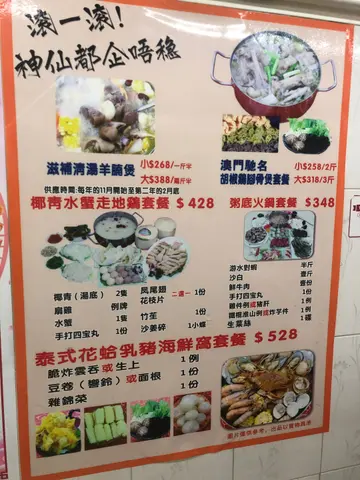 )同班姨媽姑姐食大排檔,相機食先實在有d怪,所以係完全冇相既,敬請原諒!講番重點啦,推介必食既係海鮮類,油浸荀殻算係澳門比較少有,我原本甚至吾知荀殻係咩黎,條魚輕輕拖油,真正做到皮脆肉嫩,吾好魚既我都食得津津樂道。霸王蝦既做法亦非常好食,但當日我地都冇留意d蝦吾太新鮮,扣左d分。如果去開記得先去魚缸睇下有咩靚再決定食咩。白灼螄蚶(好似咁寫)都值得一食,略帶海水鹹味,夠新鮮既灼一灼水已經好鮮味。海鮮係滿意既,但叫左道口水雞就真係敗筆(除左口水雞外其他都係大佬叫既,我點左一樣就中伏,所以真係要旁實食家先好去)口水雞感覺係白切雞淋上d汁,大大件既雞肉排得整整齊齊,汁料應該係後來淋上所以並吾入味。第二日姐妹邊爐團,叫左兩隻乳鴿,不過不失冬陰公乳豬海鮮煲,料足但吾太夠味值得一提係打邊爐必叫「響鈴」 ,類似腐皮卷既食物,淥幾秒就食得,好入味而且夠特別