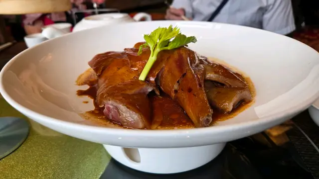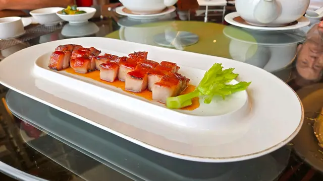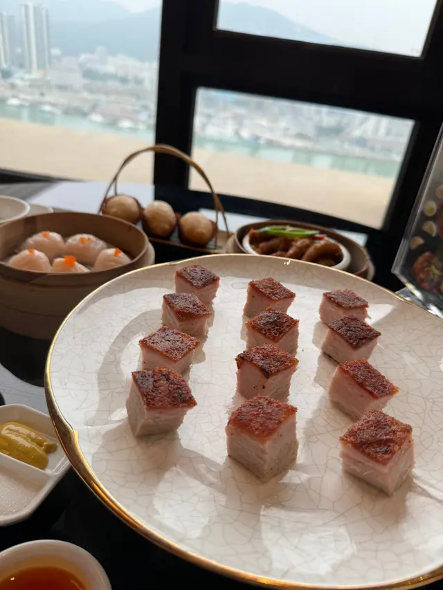一行六人在澳門十六蒲樂軒華午餐,這家酒家的環境確實很吸引!地方寬敞明亮,配上大玻璃窗,讓我們可以一邊用餐一邊欣賞澳門的美景,真是一種享受。先來兩道菜:15年陳皮蜜汁叉燒~半肥瘦的叉燒,香甜美味,軟滑可口,有咬感