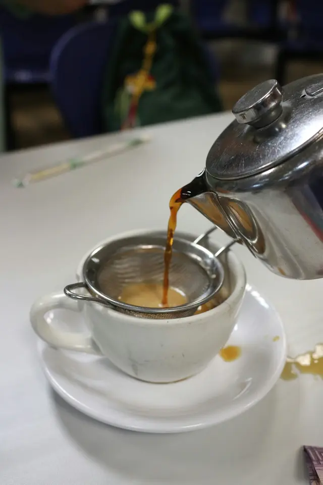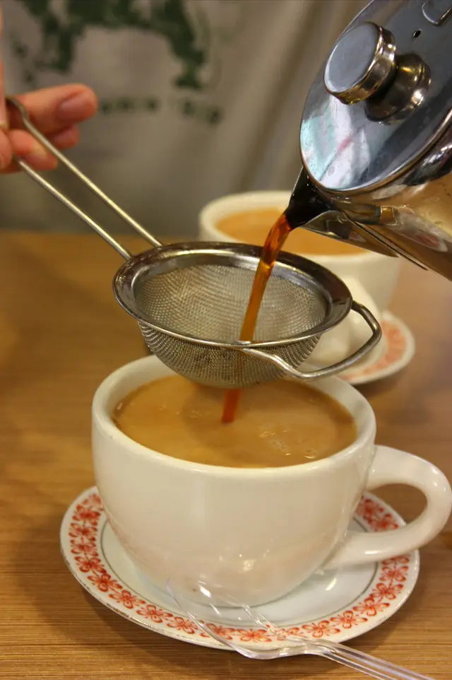 ☕️ 泉記咖啡美食|下環街市的人情味奶茶 下午茶食咩好?走進澳門下環街市熟食中心,總會被泉記咖啡美食的懷舊氣息吸引。這裡的「體貼奶茶」堪稱一絕,斯里蘭卡茶葉經人手沖煮,茶香濃郁帶炭火香氣,淡奶與熱茶分壺呈上,讓食客自調比例。倒入奶杯時需用濾網隔去碎茶葉,儀式感十足,茶底微澀卻不苦,與淡奶交融後滑順回甘,甜度自由掌控,完美詮釋澳門奶茶的細膩傳統。 搭配街市市井喧囂與老式藍色瓦斯桶背景,一杯奶茶彷彿時光倒流。泉記數十年如一日的手藝,不僅是味覺享受,更是本地生活縮影。若想體驗地道澳門早餐文化,這杯「自沖奶茶」絕對是靈魂所在! #澳門美食 #奶茶 #手沖體驗 #街市美食 #老字號情懷 #下環街市必訪 ☕️✨ 地址:下環街市綜合大樓2樓熟食中心A24檔…查看更多