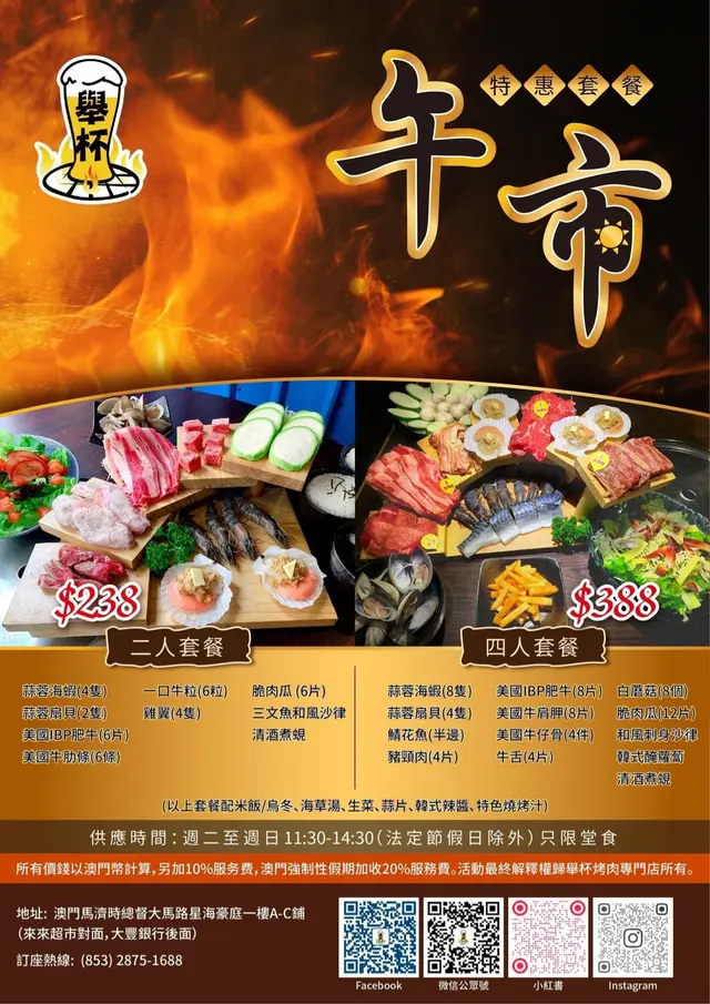 舉杯烤肉專門店 (新口岸) 網址: https://s.openrice.com/QrbS10wW600 地址: 澳門新口岸宋玉生廣場(皇朝)馬濟時總督大馬路430號星海豪庭1樓A舖 電話: +853 2875 1688