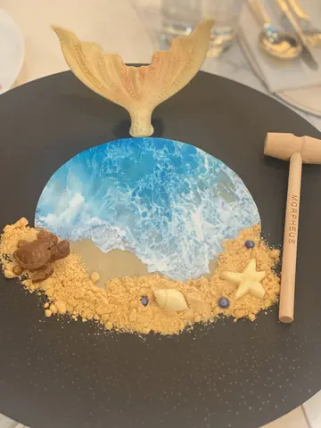 碼頭落船第一站目的地-Morpheus,坐酒店shuttle bus直達,非常方便。Zaha Hadid 矚目又破格的設計,只可用眼睛去看,而不可言喻,實在是很avant garde。在lobby的Pierre Herme Lounge,也是又享負盛名的法國殿堂級甜品大師Pierre Herme 開的。無論邊個角度睇都咁完美。Easter egg型態很有趣,加了銀箔帶點高貴feel。店員制服很有質感,服務不錯,會為客人介紹食物。Tea Ispahan ($68) 荔枝紅桑子玫瑰茶,附牛油cookie,果味香而不俗,配Ispahan甜點喝很match。Morpheus Ispahan ($138) 是Morpheus 獨家甜點。賣相精緻,先用hammer敲碎面層的脆脆,讓客人可以體驗一下,輕輕一敲便發現寶藏,內有荔枝雪芭配紅桑子、荔枝、蛋白糖霜脆脆、馬卡龍、玫瑰芝士忌廉、新鮮紅桑子,非常berry的組合,口感極有層次,玫瑰花瓣上仲有露珠,令你不得不佩服大師的工藝和巧思。Morpheus Gold ($148)這個也是另一signature,金色牛奶朱古力片很deluxe的感覺,面有geometric texture,配合到hotel的design。敲碎後,有不一樣的組合,牛奶朱古力軟心及法式忌廉、脆脆榛子蛋糕、榛子果碎,配日本蜜柑果醬及榛子雪糕,hazelnuts十分chunchy,味道豐富,平衡得很好,甜度適中,好吃得沒話好說了,很想飛去巴黎總店試別的甜點。注意要加10%service charge和政府税5%。查看更多
