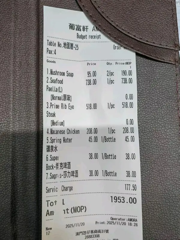 去澳門要食正宗葡國菜,朋友介紹去葡富軒,有正宗西班牙菜。酥皮蘑菇濃湯奶油蘑菇湯味道濃郁,碗上覆蓋一層脆卜卜既酥皮,酥皮口感金黃酥脆,係必點之選。經典西式海鮮燉飯海鮮燉飯香噴噴,每一口飯都有海鮮,配搭炒蔬菜及高湯一同燉煮既料理,帶著西班牙海鮮燉飯既風味。肉眼扒配香烤大蒜及手工地瓜脆條肉眼扒帶著濃郁既牛味道,牛扒脂肪紋理均勻,黃油肉汁香氣,肉質較為嫩滑,加入烤大蒜增加味道層次。食埋爽脆既地瓜脆條,就perfect。餐廳:葡富軒地址:客商街31號地舖