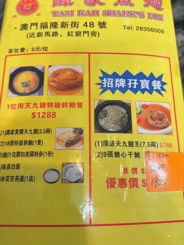 譚家魚翅 (新馬路) 網址: https://s.openrice.com/QrbS1sAi000 地址: 澳門新馬路福隆新街48號地舖 電話: +853 2835 6674