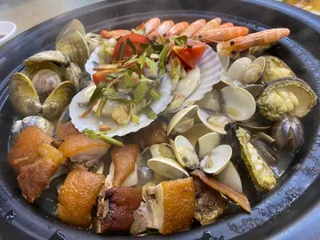 海鮮有鮑魚,扇貝,花甲,蜆。亦一些蔬菜,蕃茄。咁都有當然少不了是乳豬。