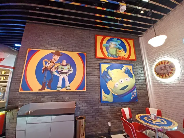 成間餐廳本身設計是按照美國70年代。再配合反斗奇兵主題,令食客更加投入電影感。有室內及半開放式坐位。半開放式可以對望巴黎鐵塔。但因有食客長期霸佔。無緣坐下。個反斗奇兵套餐,要向職員直接下單。原價$136。如果用 Visa 信用卡,有八五折。個餐包一杯無花果汁及雞肉包。個賣相用巴斯光年做主題。無花果汁有點像奶昔。好飲。個包雞肉好鮮嫩。反斗奇兵粉絲萬勿錯過。