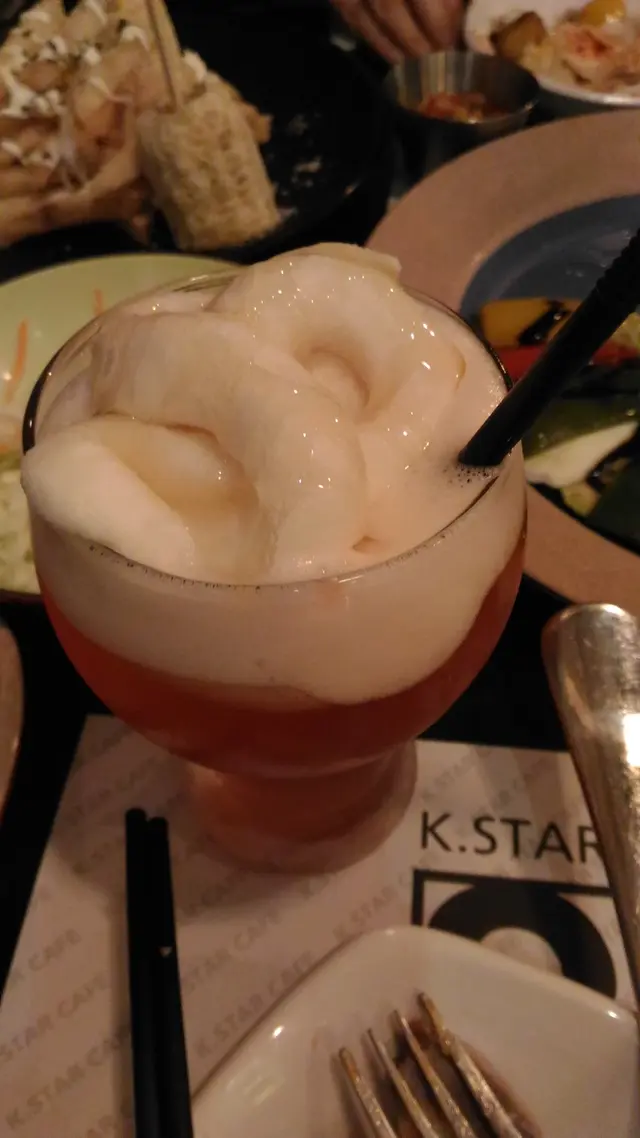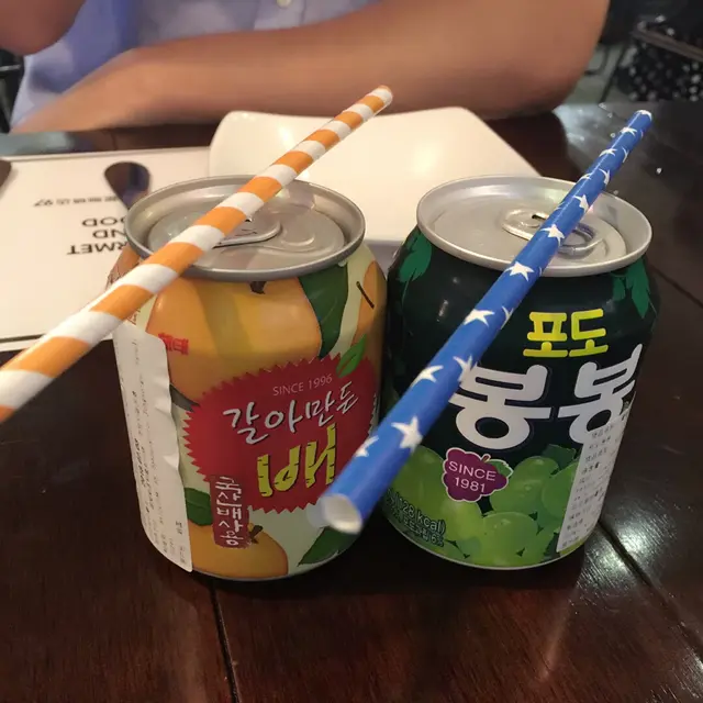 這個是點餐後,店長送的兩罐韓國小飲料,梨子那瓶很不錯,而且有果粒,葡萄的就太甜了。這個是海鮮燴飯,不能吃辣的就要一邊喝飲料一邊吃這個飯,哈哈,不過是好吃的。海鮮的份量很足,其實也有很多蝦子在內