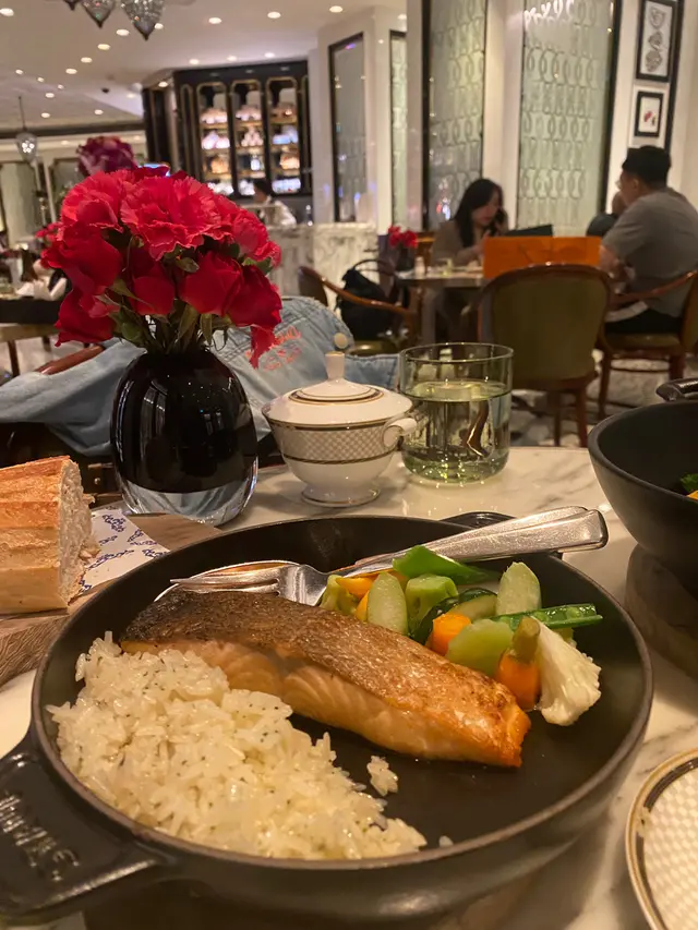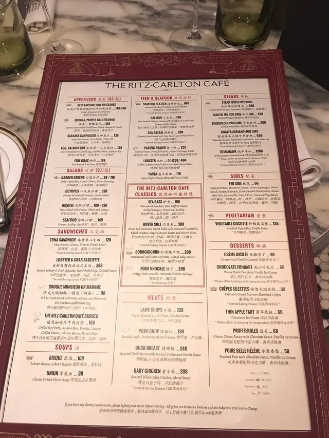 好耐冇過去澳門食嘢,我覺得澳門嘅五星級酒店物價比香港平好多,於是就去咗麗斯卡爾頓咖啡廳試吓。服務人員好細心介紹是日推介嘅菜品,又會問我同朋友有冇食物敏感嘅情況,於是推介左蘋果片泡沫煎鵝肝、紅酒炆牛肉蘑菇配薯蓉同香煎三文魚配西班牙米飯。坐低之後即刻會有餐包同牛油附上,餐包可以無限添加,而佢哋嘅牛油都係手做,加入咗忌廉色食嘅時候更加creamy。我都幾鍾意佢哋煎鵝肝呢個前菜,加入咗蘋果之後酸酸甜甜都幾得意,而且好開胃。紅酒炆牛肉就整得太冧,雖然好香紅酒味,但我唔太鍾意呢個口感。而三文魚嘅魚油好香,配埋西班牙米飯成個餐就啱啱好夠飽。整體嘅服務好流暢,而且服務員好細心,價錢會稍為偏貴,但都符合食物嘅質素。…查看更多