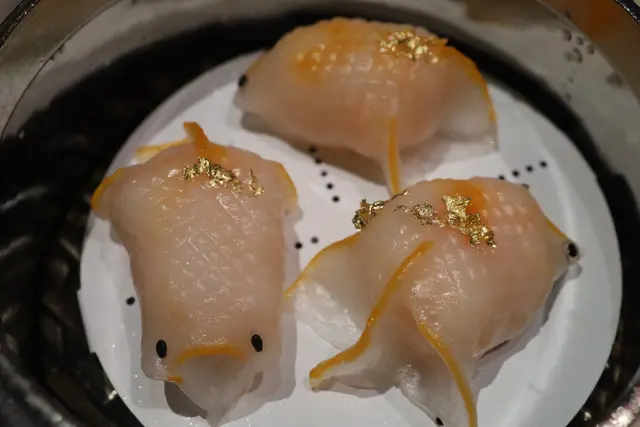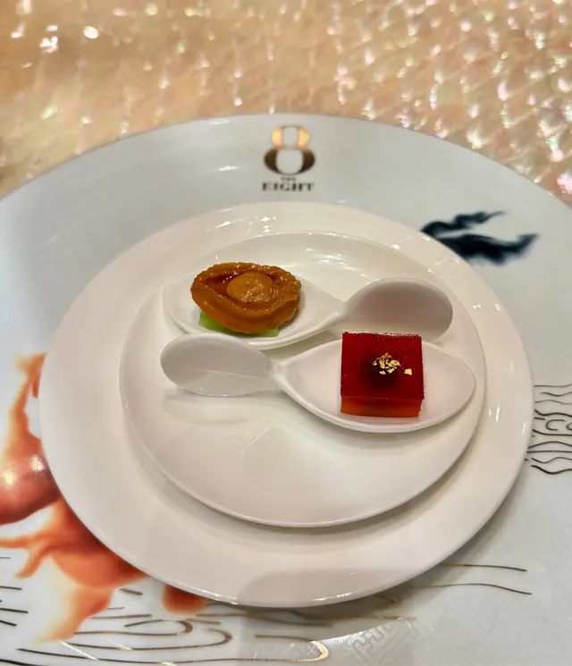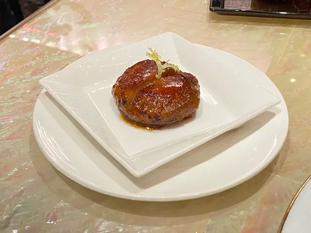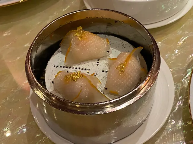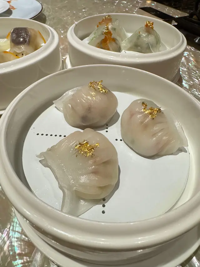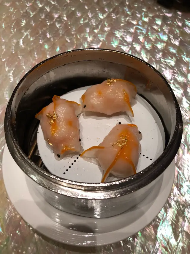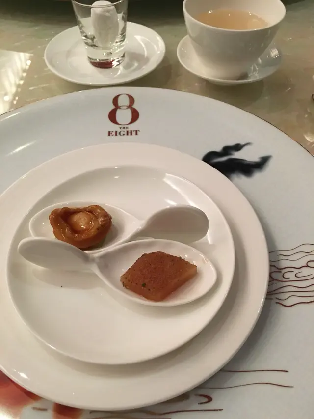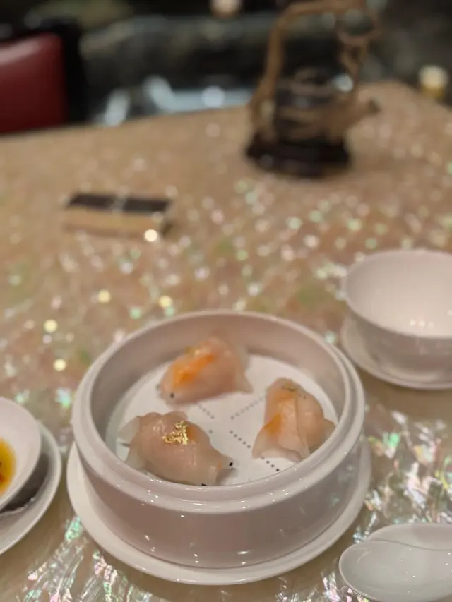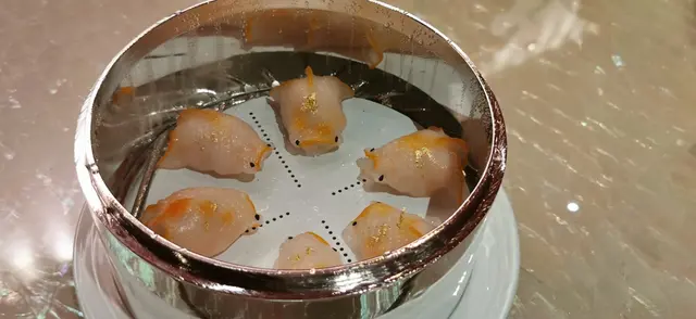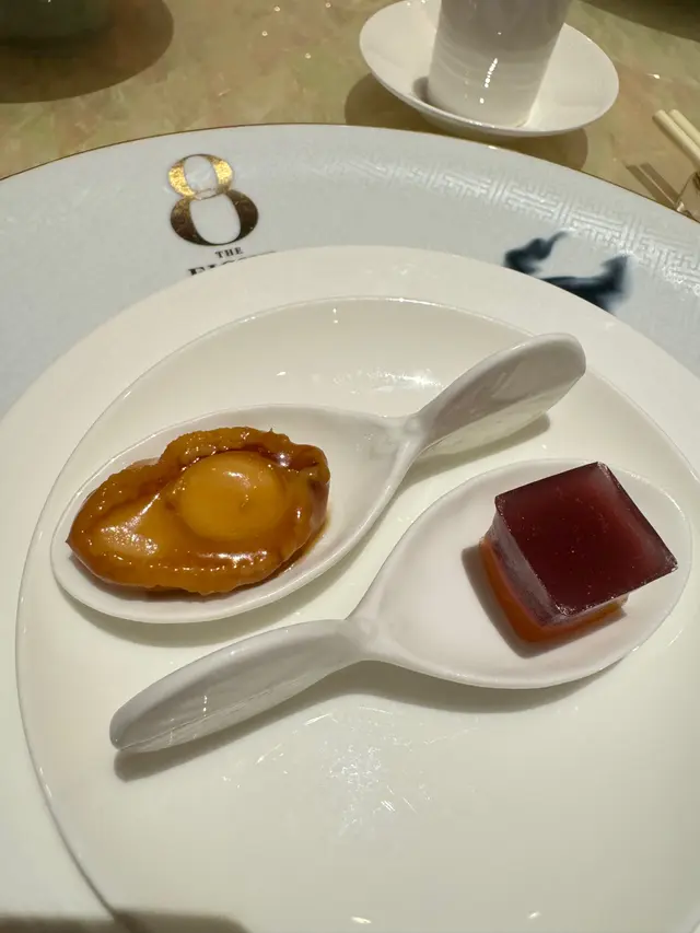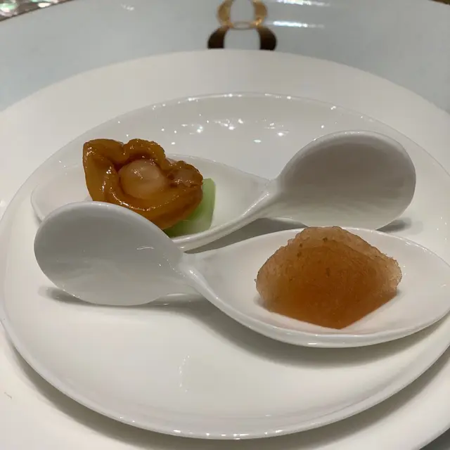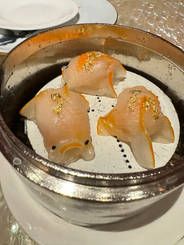 闊別澳門十多年後重遊,不知何時會再來,臨走朋友希望吃魚翅,大家當然舉腳贊成。以前曾在此食府用膳,那時亦以金魚作裝飾主題,多年後重臨,主題依舊,但整體裝修更添華麗。點了幾款點心和鮑翅,忽然待應便奉上每人一碟內有小鮑魚和梅子啫喱的開胃菜,雖然開胃菜並不特別美味,但還是讓我們有意料之外的驚喜。胖嘟嘟的金魚餃造型非常可愛,餃皮晶瑩明亮,藍天使蝦爽彈蝦味濃,令金魚餃的色、香、味更立體。黃魚餃的造型滑稽,餃皮有韌性但有點厚,魚肉餡料嫩滑,然而鮮味比較淡,百合米湯的質感很是濃稠,帶淡淡的粉香,整體平均,但試一次便可。牛肉球的賣相頗為有趣,穿上竹笙外衣的牛肉球就像一個球形的小蜂窩,窩孔吸滿了醬汁,為牛球保持濕潤,不須喼汁的加持也很美味。腸粉的粉皮十分剔透,清晰可見內裡滿滿的餡料,黑豚叉燒香甜嫩滑,薑芽起了點睛的作用,增香解膩。💢紅燒大鮑翅魚翅如一把扇般浸在琥珀色濃稠的高湯芡汁中,翅針根根分明,有別於仿翅的口感,魚翅入口軟滑,一梳一梳的小翅扒掛滿高湯芡汁,湯汁味濃醇厚,搭配的銀芽也飽滿閃亮,讓人很是滿足。葡撻和奶茶也是意外的餐後甜點,葡撻有點過甜而且蛋香不足,奶茶倒是幼滑,如同開胃菜一樣,這料想不到的甜點,成為這頓餐食的完美結局。埋單時,侍應送上每人一塊曲奇作為小禮物,心思可見一斑。…查看更多