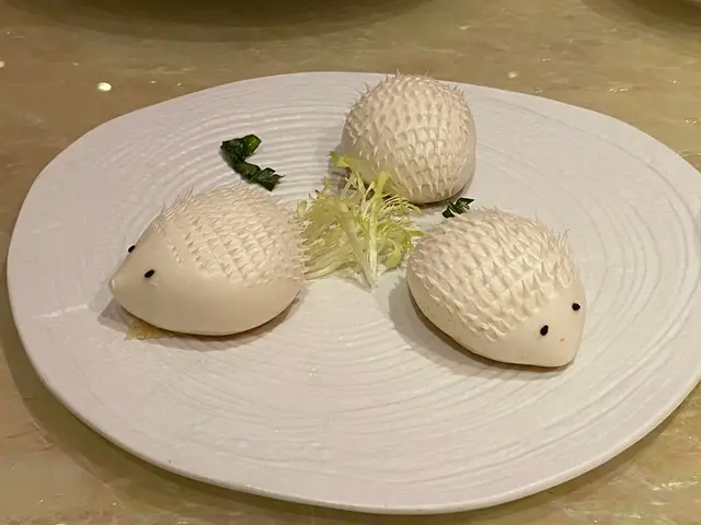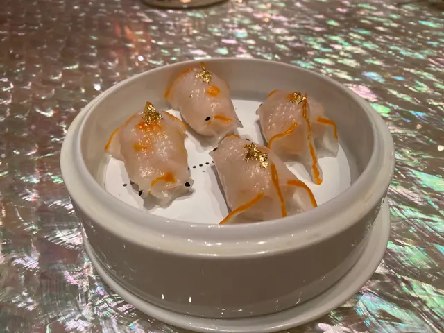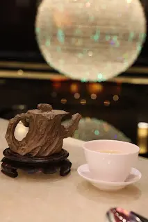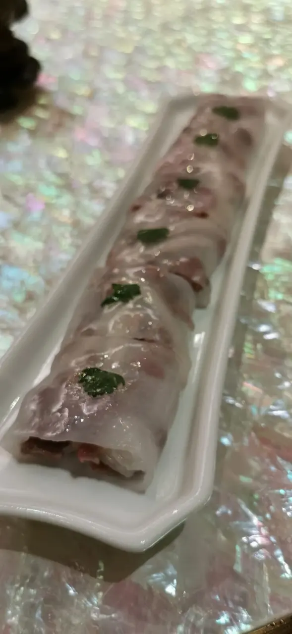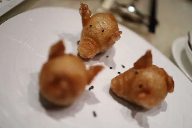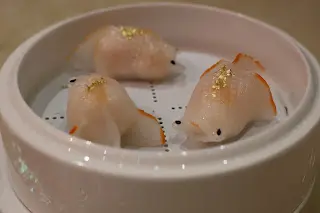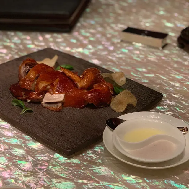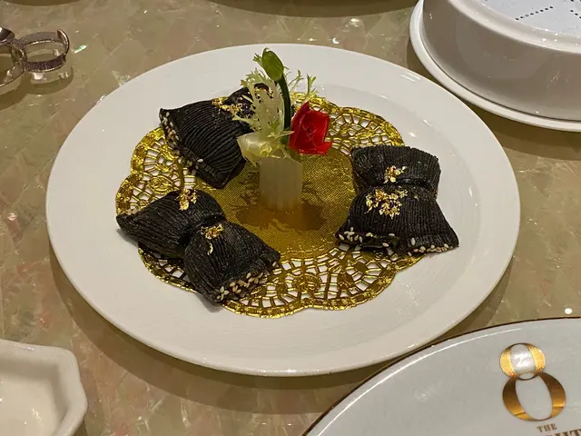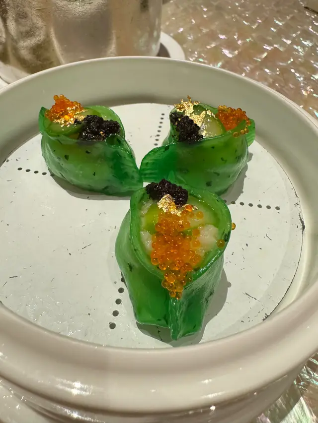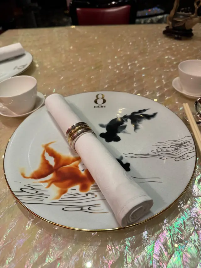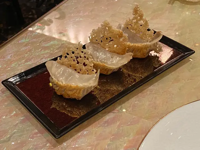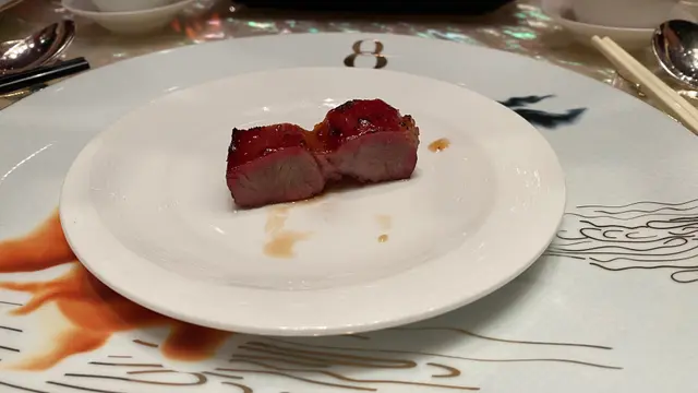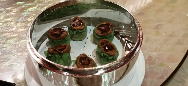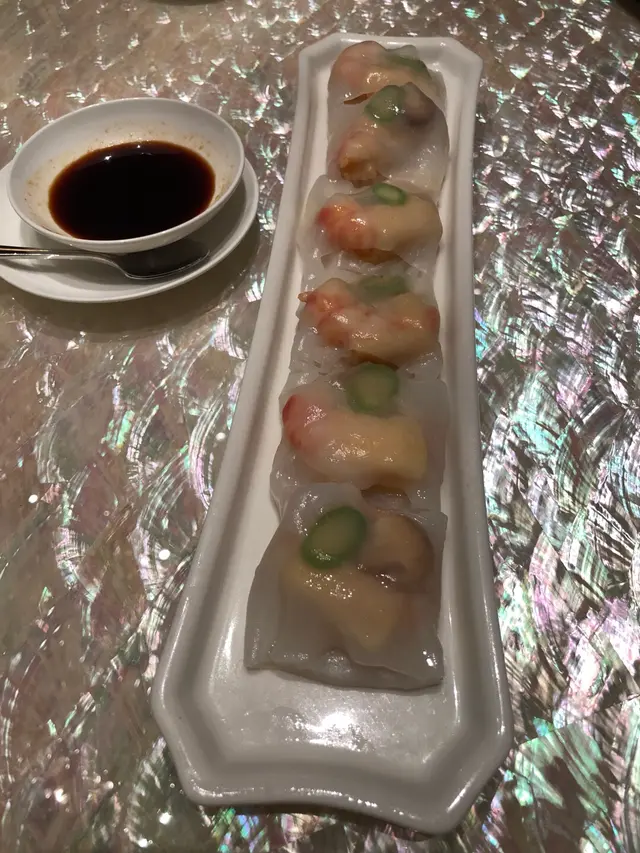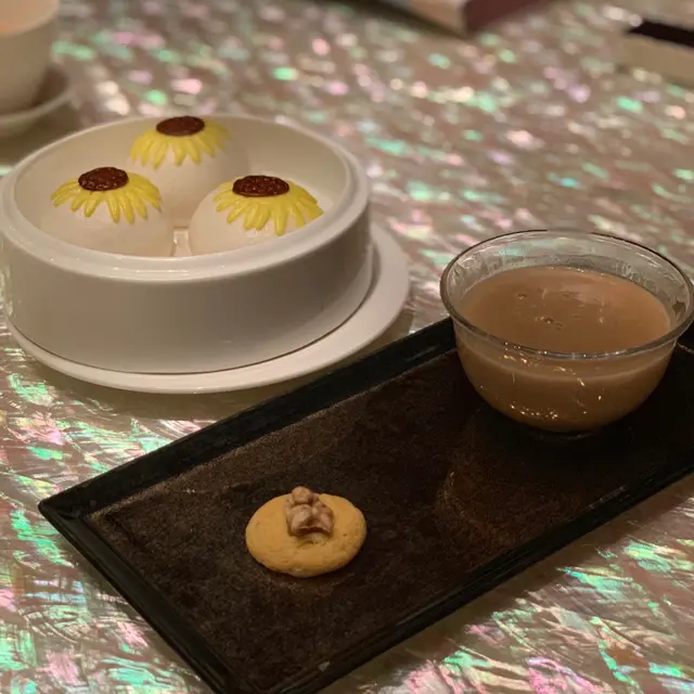 闊別澳門十多年後重遊,不知何時會再來,臨走朋友希望吃魚翅,大家當然舉腳贊成。以前曾在此食府用膳,那時亦以金魚作裝飾主題,多年後重臨,主題依舊,但整體裝修更添華麗。點了幾款點心和鮑翅,忽然待應便奉上每人一碟內有小鮑魚和梅子啫喱的開胃菜,雖然開胃菜並不特別美味,但還是讓我們有意料之外的驚喜。胖嘟嘟的金魚餃造型非常可愛,餃皮晶瑩明亮,藍天使蝦爽彈蝦味濃,令金魚餃的色、香、味更立體。黃魚餃的造型滑稽,餃皮有韌性但有點厚,魚肉餡料嫩滑,然而鮮味比較淡,百合米湯的質感很是濃稠,帶淡淡的粉香,整體平均,但試一次便可。牛肉球的賣相頗為有趣,穿上竹笙外衣的牛肉球就像一個球形的小蜂窩,窩孔吸滿了醬汁,為牛球保持濕潤,不須喼汁的加持也很美味。腸粉的粉皮十分剔透,清晰可見內裡滿滿的餡料,黑豚叉燒香甜嫩滑,薑芽起了點睛的作用,增香解膩。💢紅燒大鮑翅魚翅如一把扇般浸在琥珀色濃稠的高湯芡汁中,翅針根根分明,有別於仿翅的口感,魚翅入口軟滑,一梳一梳的小翅扒掛滿高湯芡汁,湯汁味濃醇厚,搭配的銀芽也飽滿閃亮,讓人很是滿足。葡撻和奶茶也是意外的餐後甜點,葡撻有點過甜而且蛋香不足,奶茶倒是幼滑,如同開胃菜一樣,這料想不到的甜點,成為這頓餐食的完美結局。埋單時,侍應送上每人一塊曲奇作為小禮物,心思可見一斑。…查看更多