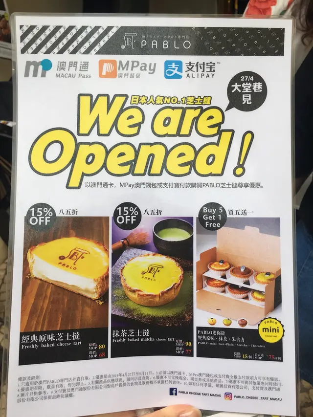 唔知算唔算係芝士撻嘅始祖呢?原來而家唔使去到日本或者泰國都有得食。香港冇呢一間所以嚟到澳門一定要去試一試,本來以為好多人會排隊,但係點知今次一嚟冇人排隊喎。新馬路好多食店都要排隊,而且好多人,我諗我都算好好彩啦。店面非常之搶眼,一見到就知道係Pablo。呢度裝修好新淨,我諗都開咗冇耐。見到除咗只是他之外仲有沙冰、雪糕等等。不過啱啱食完野有啲飽,所以我同朋友叫咗兩個迷你芝士撻炸。價錢來講呢系有少少貴, $15一個。而澳門好出名嘅葡撻都只係$10一個。拎到上手已經有少少扣分,因為個芝士撻係凍嘅,一啲都唔亂。可能因為太凍,所以蛋撻個面呢系巢皮既,影相見到唔夠飽滿。咬落口發現冇留心嘅感覺,中間一樣係熟曬嘅,有啲失望😞。曲奇皮算係幾鬆化,不過鬆化得來有啲散。整體來講同我喺日本或者泰國食嘅好似都差幾遠下,一定要首先改善下芝士撻嘅溫度啊。查看更多