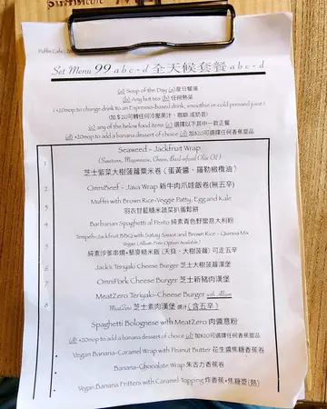 Puffin cafe係大三巴附近,位置方便。有實體menu,亦有ipad睇食物相。以下2款食物本身應該冇五辛,不過唔食五辛嘅朋友最好落單時再向店員確認一下。開心下午茶 (MOP $79)Weekdays 15:00 - 18:00迷你漢堡或卷 + 湯及茶或美式咖啡芝士素菠菜卷本身以為加咗芝士會好膩,但食落又唔會,因為入面除咗有芝士同菠菜醬,仲有粟米粒、西蘭花同蘑菇等配菜。餅皮乾身。芝士大樹菠蘿漢堡迷你漢堡嘅大細啱啱好,唔會太飽。中間夾住嘅炸大樹菠蘿味道較淡,外層嘅粉漿比較厚,唔係好食到大樹菠蘿嘅質感,感覺比較膩。湯紅菜頭湯幾好飲,有香草嘅味道,飲落有少少creamy。茶凍檸茶…查看更多