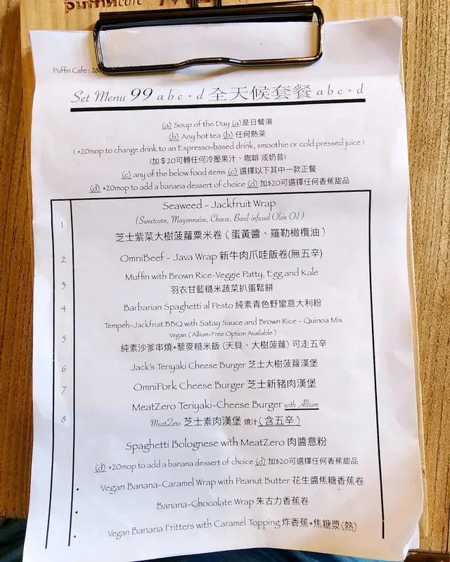 Puffin cafe係大三巴附近,位置方便。有實體menu,亦有ipad睇食物相。以下2款食物本身應該冇五辛,不過唔食五辛嘅朋友最好落單時再向店員確認一下。開心下午茶 (MOP $79)Weekdays 15:00 - 18:00迷你漢堡或卷 + 湯及茶或美式咖啡芝士素菠菜卷本身以為加咗芝士會好膩,但食落又唔會,因為入面除咗有芝士同菠菜醬,仲有粟米粒、西蘭花同蘑菇等配菜。餅皮乾身。芝士大樹菠蘿漢堡迷你漢堡嘅大細啱啱好,唔會太飽。中間夾住嘅炸大樹菠蘿味道較淡,外層嘅粉漿比較厚,唔係好食到大樹菠蘿嘅質感,感覺比較膩。湯紅菜頭湯幾好飲,有香草嘅味道,飲落有少少creamy。茶凍檸茶…查看更多