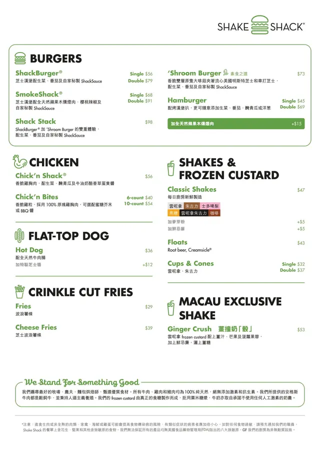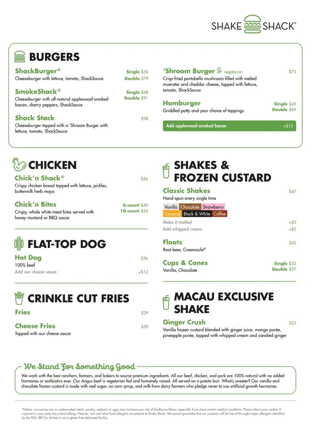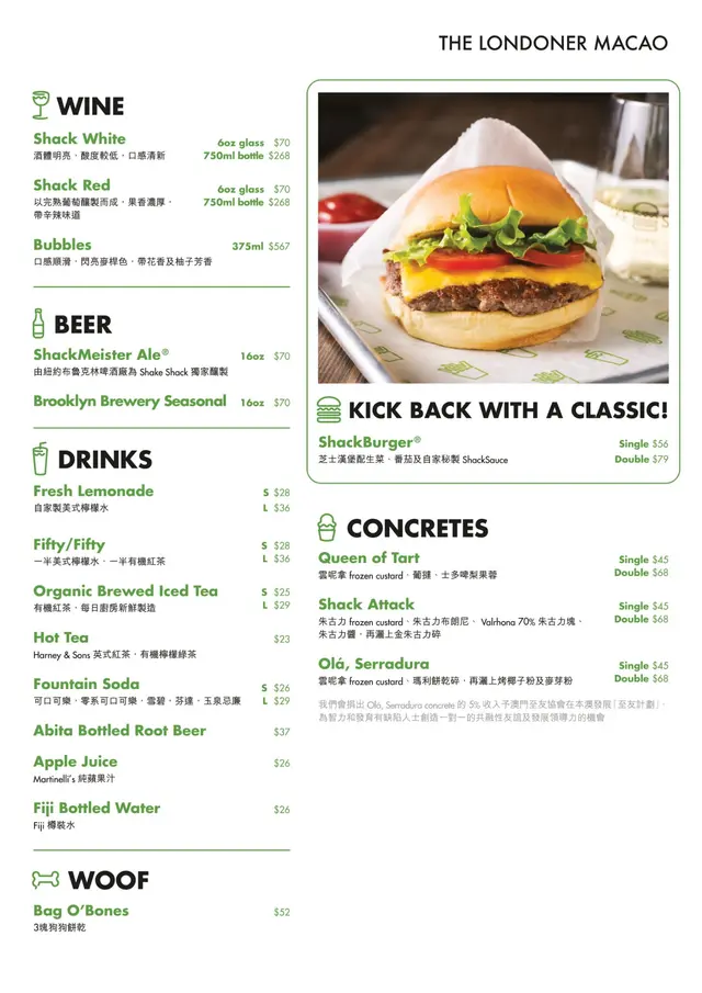 SHAKE SHACK (路氹城) 網址: https://s.openrice.com/QrbS18i8A00 地址: 澳門路氹城路氹連貫公路澳門倫敦人2樓2200號舖 電話: +853 28898823