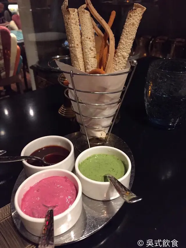 餐前小食有印度薄餅及麵包脆條,附上三款印度醬料。