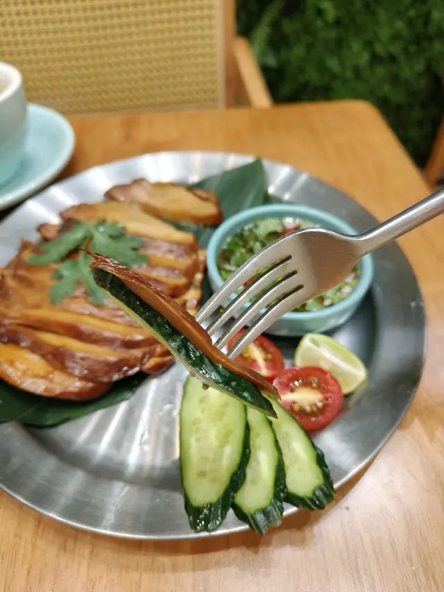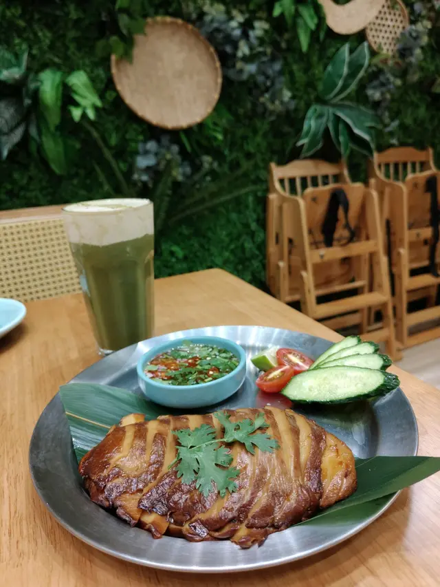 「烤魷魚」以素製品演繹出驚人逼真感🔥,金黃焦香的表面泛著油光,搭配紅辣椒香草醬更顯東南亞風情。