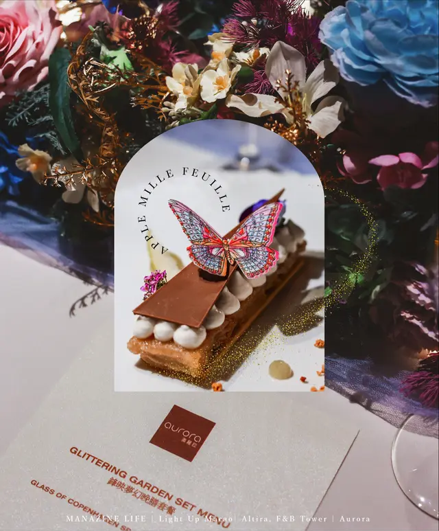 以雲呢嗱法式酥餅,卡巴杜斯蘋果酒忌廉,和蜂蜜薄脆製成的蘋果千層酥,表面配上蝴蝶裝飾,甜到心窩里,整個體驗盡顯廚師功駕,這個聖誕非常推薦大家到奧羅拉享用這個豐厚的晚宴!