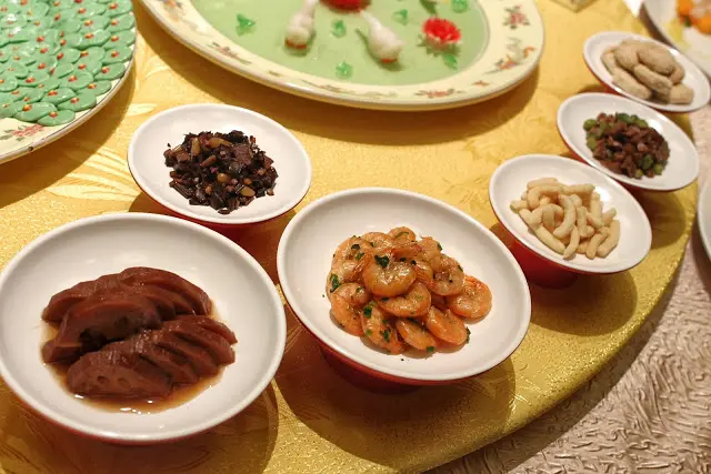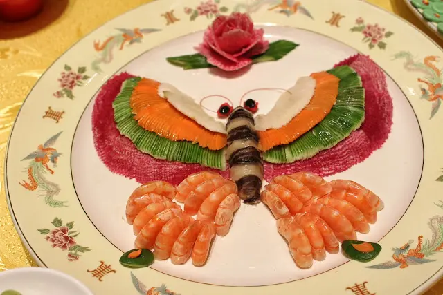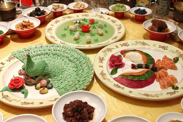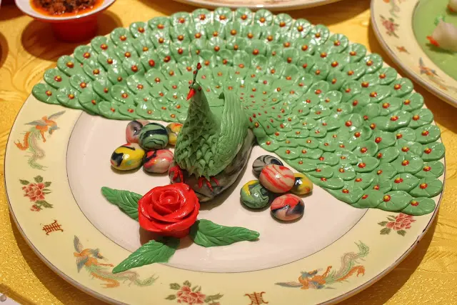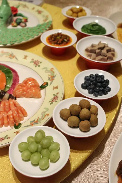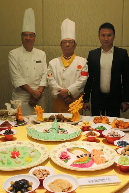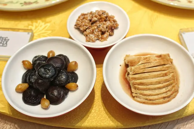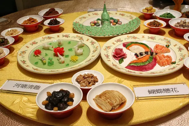 由於菜式太多又太美,酒店先安排一套食物給我們拍照。紅樓宴的關鍵環節,是看盤 大觀一品 Grand view of the Red Mansion,三個大盤拼成一個品字,意為賈府中的一品菜餚。