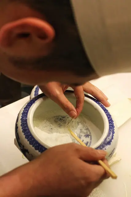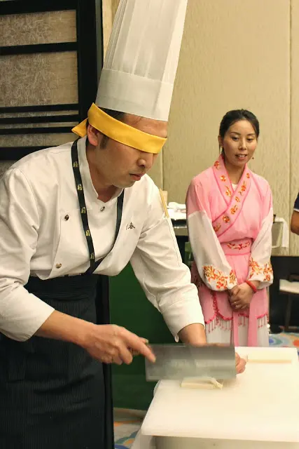 然而品嚐紅樓宴的,還可欣賞揚州師傅即場蒙眼表現刀功:飛快將豆腐切絲也算了,之後還能引水穿針,這也太強了吧?