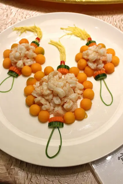 又有 瀟湘果品 Xiao Xiang Snack:蜜餞青果 Preserved fruit; 白炒瓜子 fried melon seeds; 琥珀合桃 honey coated walnut; 糖炒栗子 wok fried chestnut; 荔枝 lychee; 櫻桃 cherry; 青提 grape; 桂圓 longan,其中飯前吃水果正正體現紅樓夢中養生的概念。