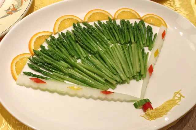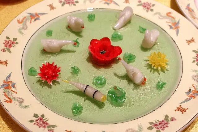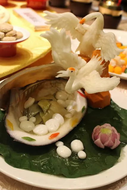 又有紅樓夢中鳳姐作弄劉姥姥的 姥姥鴿蛋 Simmered pigeon eggs with carrot, asparagus and bamboo pith,晶瑩剔透的鴿蛋營養很高,但質地軟滑挺難挾,如可一次成功會帶來好運呢。