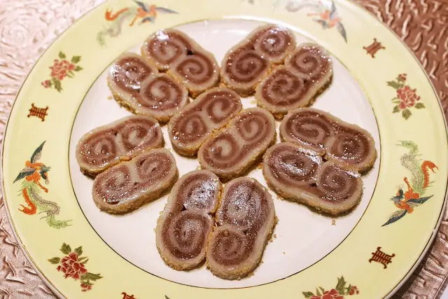 以寶玉帶在身上的長命鎖為造型的 如意鎖片 Steamed glutinous rice dumplings with red bean paste and shredded coconut,就有點似驢打滾,滋味煙韌微甜。