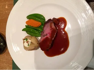 主菜通常有5至6款,其中一種係是日燒烤。我通常都會選呢個,每一次都會有唔同款式。今次係燒西冷牛扒,牛扒比較瘦身,燒到外面熟,中間就大概6成熟,顏色仲有點紅,對我來說就差不多了。