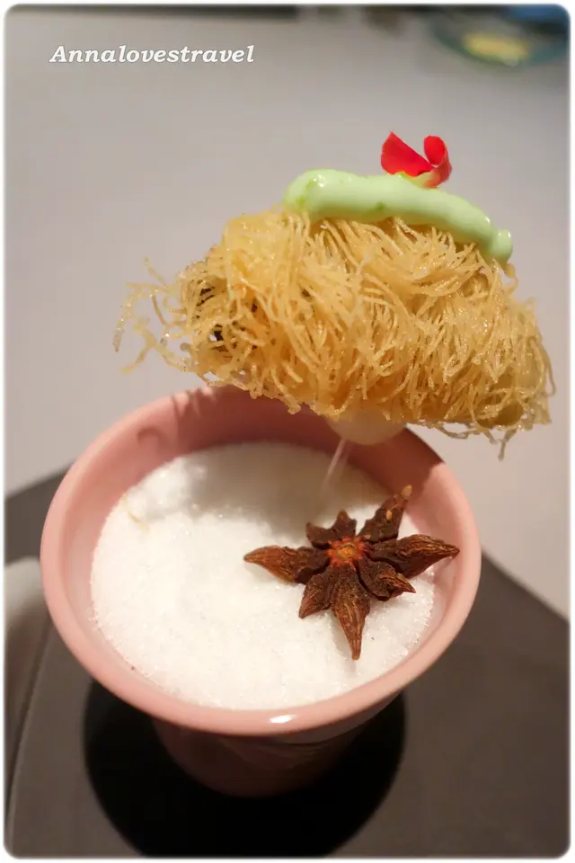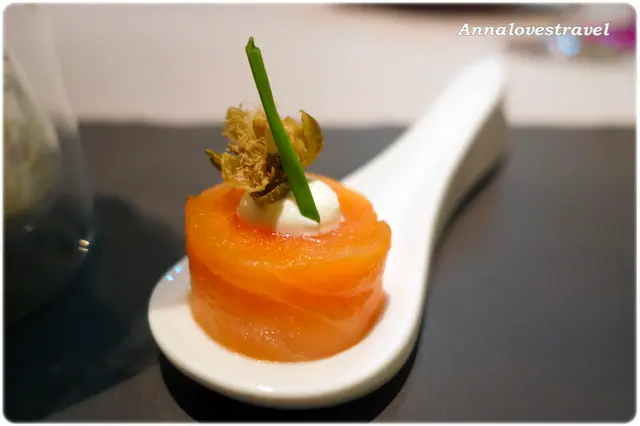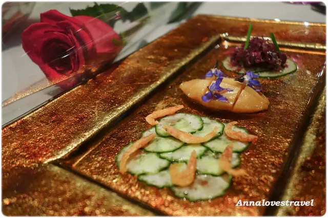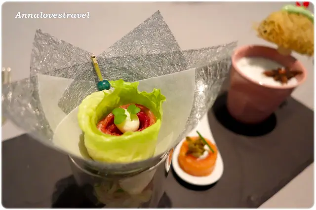 「花之戀」的餐前小吃,設計成花兒的樣子,精緻至極。三款小吃,由左吃到右,同樣內外在美兼備。Candied Bacon Rose 以菜葉捲著煙肉,扮演玫瑰花的花芯;清新與咸香兩種味道平衡得宜。