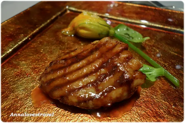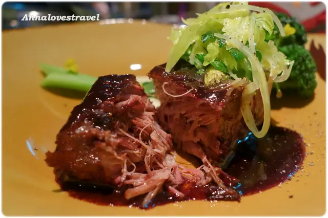 牛肉方面,是以美國牛肋骨製作的 Braised USDA Boneless Beef Rib。一絲一絲的牛肋骨,煮得十分鬆軟,並瀰漫著濃郁的肉味。配合酸甜醬汁,相當開胃。而爽口的小西蘭花,則帶出了「花」的主題。