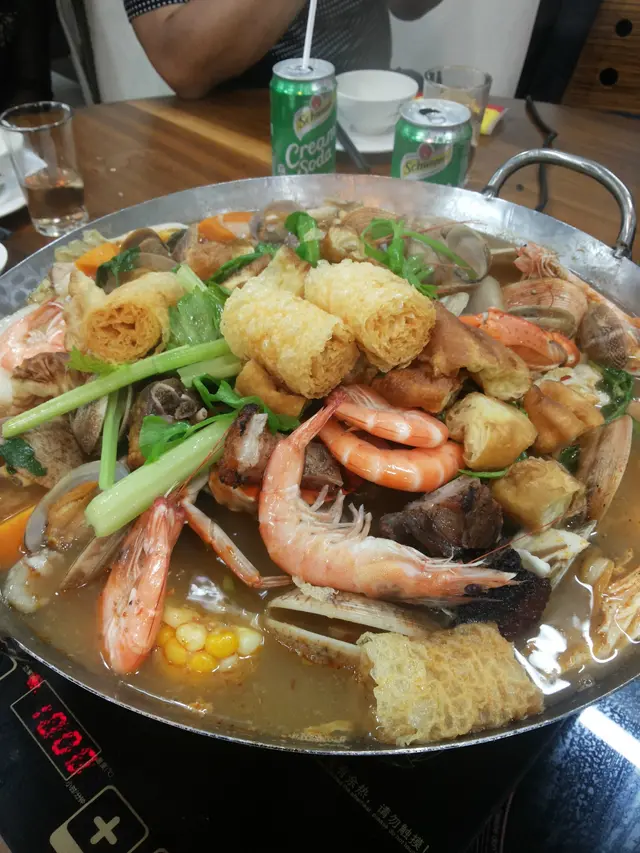 等待不久, 花蛤乳豬鍋上桌。花蛤乳豬煲當然是有花蛤和乳豬吧! 不過也有如粟米, 蘿蔔, 芹菜等素菜; 又有蝦隻, 小蜆等海鮮用料; 也有如腐竹, 響鈴等吸湯食物。猶如一品鍋, 大雜薈。花蛤煲可選擇辣度, 基本上辣一點, 風味再濃一點。可惜同行人士中有人強調不吃辣, 那種雅興當堂給打得體無完膚。