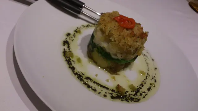 接著是烤馬介休配青菜,圓筒型造型像個撻,頂層有些脆脆的像面包糠,底層是馬鈴薯,中間則層層疊夾著馬介休及青菜,口感特別味道的層次豐富。
