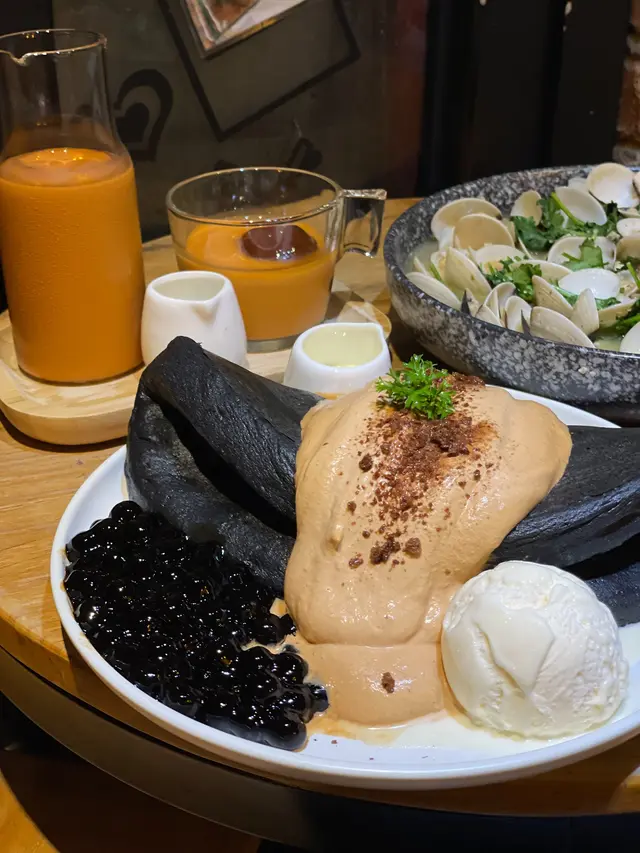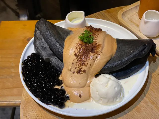 期待已久的梳乎厘班戟🖤,果然不失我所望! 班戟不但視覺效果驚人,味道都好好哦。烏黑的竹炭梳乎厘班戟,配上香濃的泰式奶茶忌廉,香甜彈牙的黑糖珍珠及雲尼拿雪糕🍦,有誰能抗拒呀~