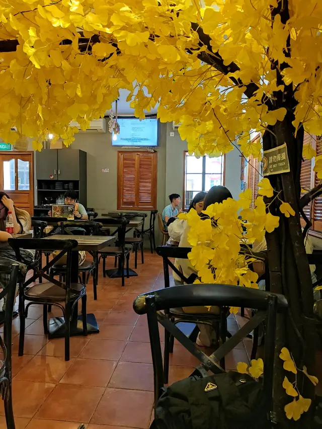 疫情後首次重遊澳門, 帶路友人指示這潮型咖啡屋, 位處街角站, 外面典型歐陸感, 內裏佈置簡約, 至吸睛是店中央放了一株黃色假樹, 成為打卡位👏