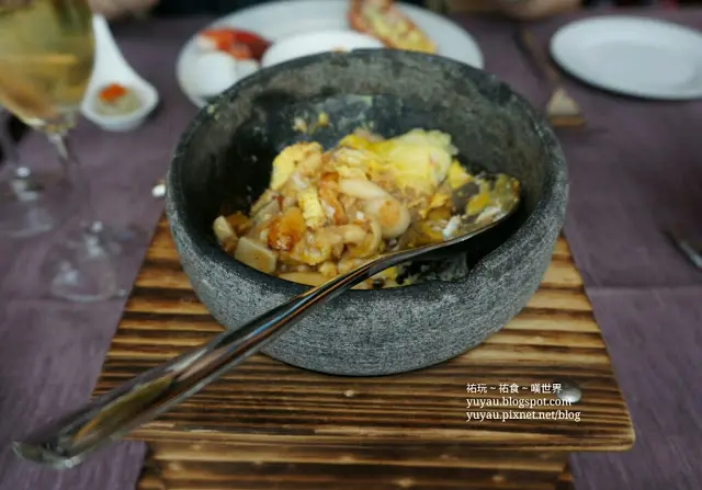 店員送來了一份石鍋,說是大廚的創意菜式供我們嘗嘗