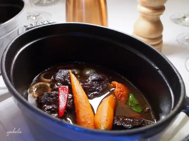主菜是紅酒慢燉牛臉頰配胡蘿蔔、洋蔥及蘑菇伴牛油焗飯,是兩小鍋呈上