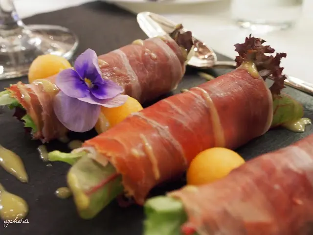 巴約訥火腿併盤配法國凱爾西蜜瓜雪葩 一般吃火腿都會捲著蜜瓜來吃