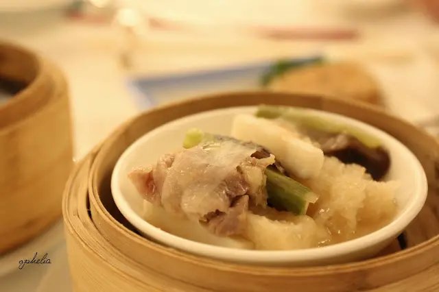 淮山滑雞扎 ﹝MOP$45﹞ 薄得透光的淮山片圈著雞肉、香菇、魚肚、筍條和淮山條