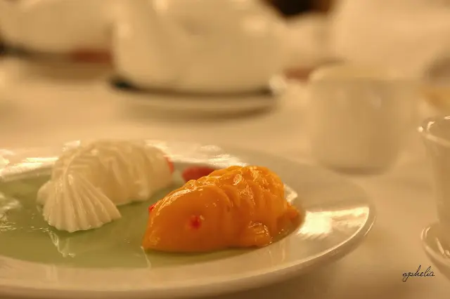 這鴛鴦凍 一尾魚是芒果布丁,而另一尾是椰汁口味的~ 那綠色的湖水帶微獨特味道不討喜