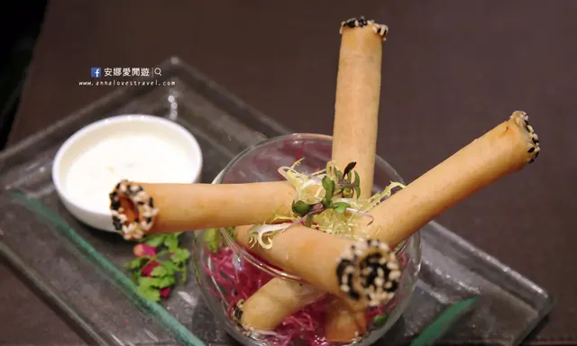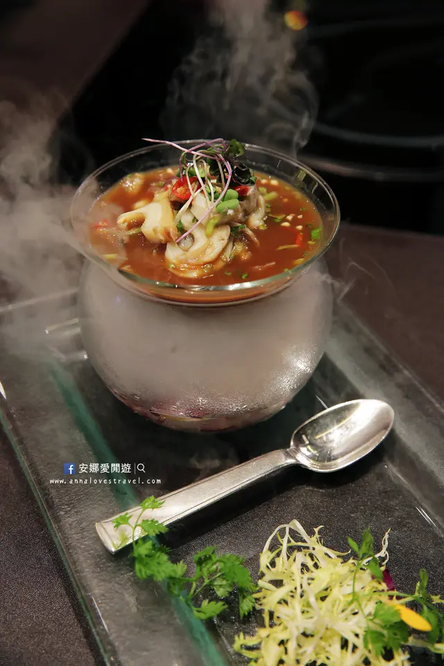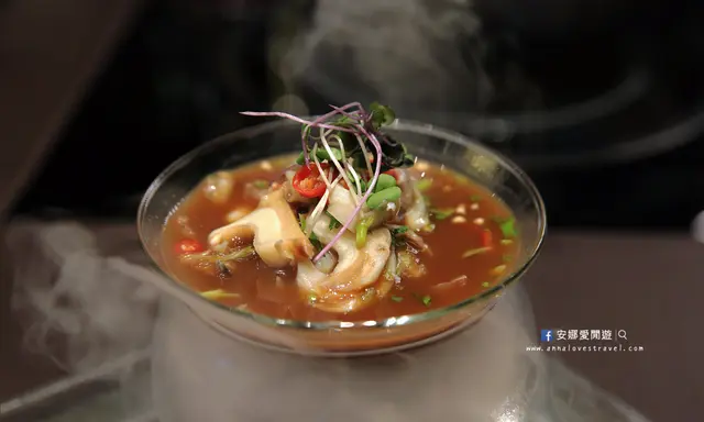 接著來兩道香煙裊裊的一冷一熱前菜。冷的,是冰鎮青芥末汁浸花螺仔,一上場便仙氣四溢。酸酸辣辣的芥末汁,帶點異國風情。花螺十分爽脆,泡過醬汁之後,那股辣勁不能小看。