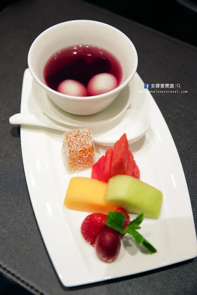最後的甜品是紫薯薑茶湯丸拼時令水果。特別喜歡湯丸的部分,湯的甜度和辛度恰到好處,不慍不火。配合兩顆暖胃的寧波湯丸,皮薄餡優,令人滿足。