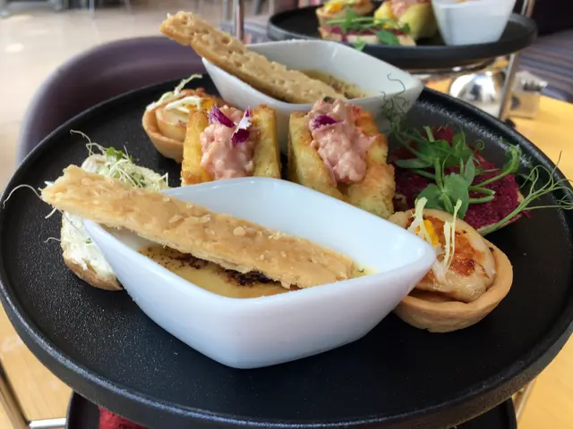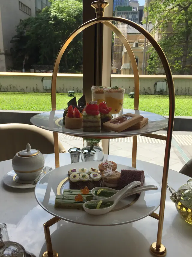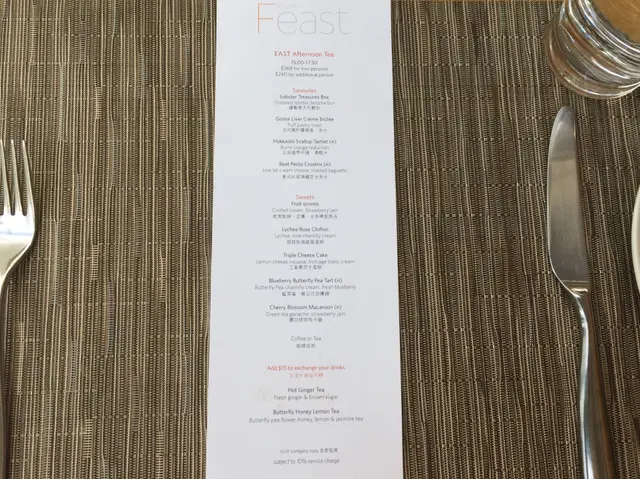 We tried the new afternoon tea set at Feast, East Weekend Afternoon Tea with a floral twist a few days ago. It was a delightful surprise.We had thought Feast a good place to chill for its high ceilings, smart décor, cleanliness and convenient location despite our not so extraordinary dining experiences before but this visit was a pleasant surprise to us. The food tasted new and exciting.For the tea set, they had nine items—four savories, four sweets and fruity scone. We three had the Illy coffee this time but they also offered two special sweet teas and the standard Twinings tea.All four savories were delicious. We thought the Goose Liver Crème Brûlée with puffy pastry toast was special because it wasn't greasy like the pan-fried foie gras nor did it have the queer raw taste. It was simply savory. Their Lobster Brioche and Scallop Tartlet were well prepared and so was the refreshing Beet Pesto Crostini.The Fruity Scone was a bit crumbly but fine with strawberry jam and clotted cream.Then we devoured the lovely desserts. The Lychee Rose Chiffon was fragrant and the zesty and rich Triple Cheese Cake with lemon cheese mousse and fromage blanc cream was exciting. The sharp looking Blueberry Butterfly Pea Tart with butterfly pea Chantilly cream and fresh blueberry was lovely. Lastly, Cherry Blossom Macaron with green tea ganache and strawberry jam was a surprise to me. The salty cherry blossom on top with macaron crust and the rich filling went surprisingly well.The food quality had improved from our last visit from decent to excellent with good service as always. …查看更多